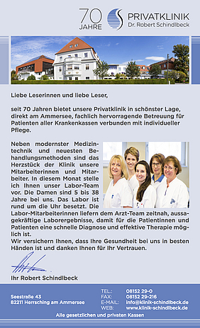 In unserem Jubiläumsjahr stellen wir Ihnen nun in jedem Monat das Herzstück unserer Klinik vor: unsere Mitarbeiterinnen und Mitarbeiter. Im August zeigen wir Ihnen unser Labor-Team, Die Damen sind 5 bis 38